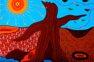 The potential solutions for healing and restoration of wellbeing come from considering additional factors encompassing issues of symptom presentation and service delivery, such as education and training, policy, the socio-political context and international perspective. As the final painting suggests, we can only exist if firmly grounded and supported by our community and spirituality, whilst always reflecting back on culture in order to hold our heads up high to grow and reach forward to the experiences life has waiting for us.