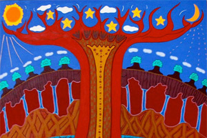 The spiritual landscape is represented by the tree of life connecting the inner core of the earth to the outer dimensions of the universe.